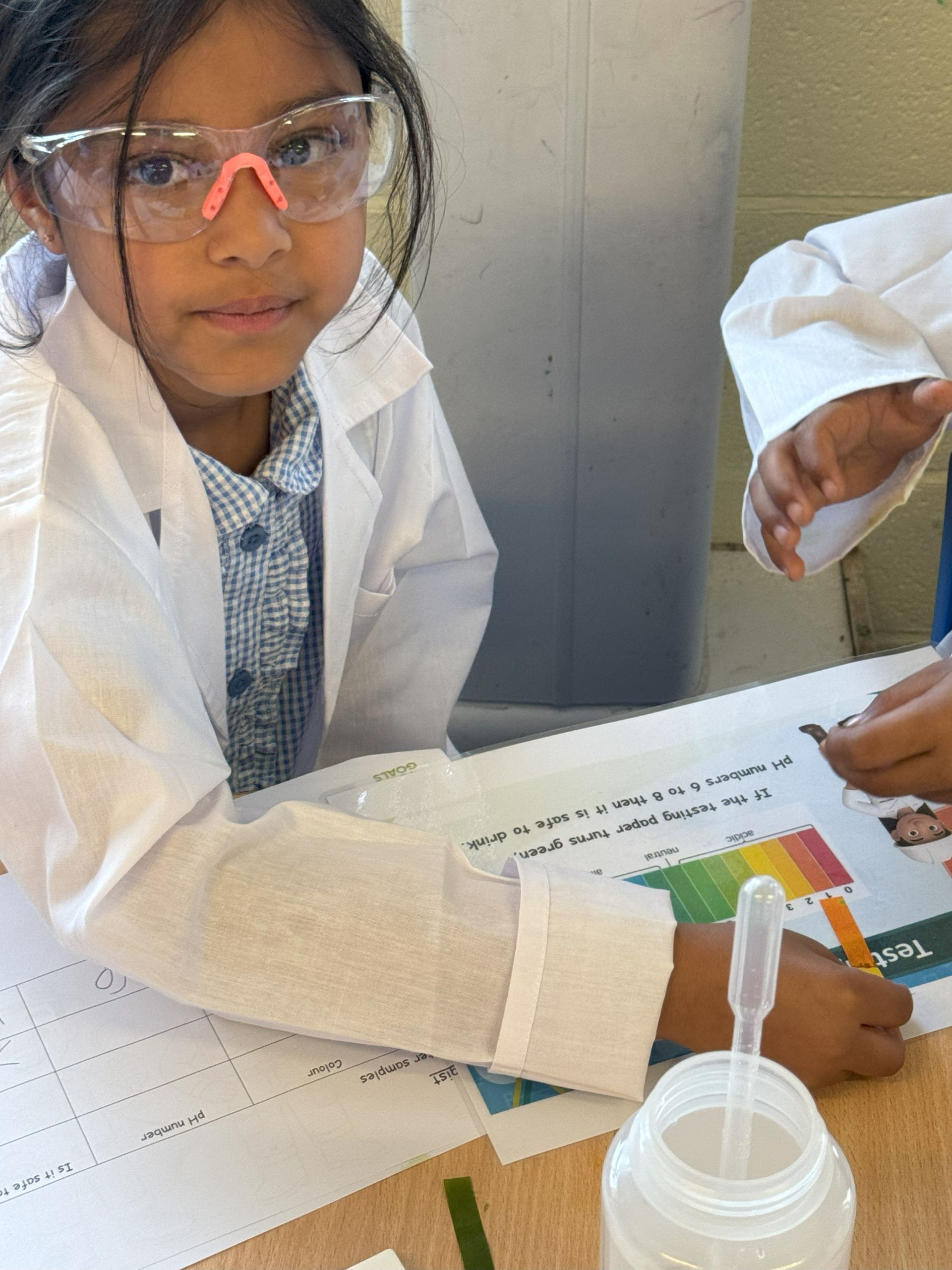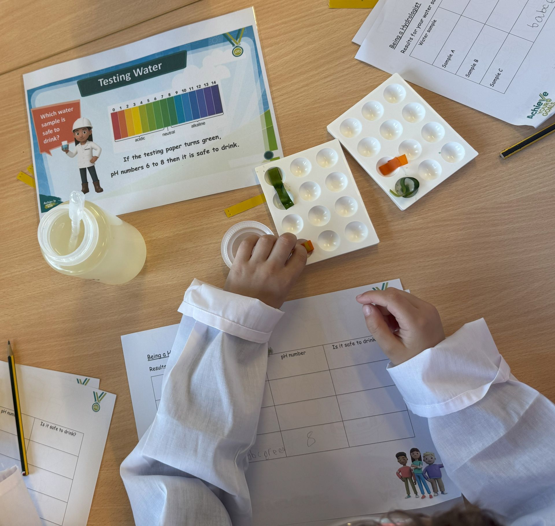Wearing lab coats and safety goggles, pupils explored the work of hydrologists. Using pipettes, they collected water samples and tested pH levels using universal indicator paper. This hands-on experiment helped pupils understand the importance of clean water and how scientists monitor water quality.